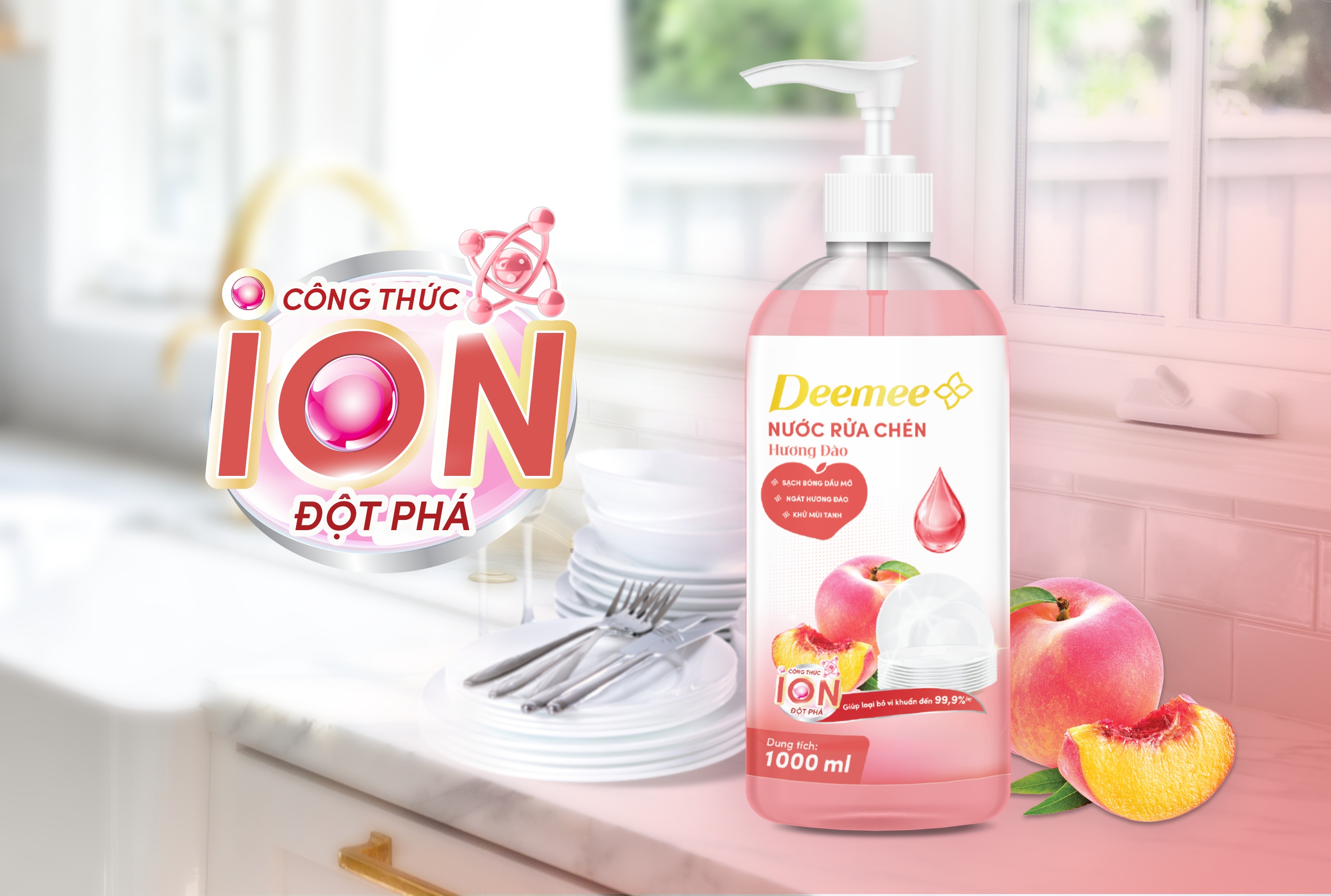 Nước rửa chén Deemee Hương Đào với công thức ION đột phá diệt khuẩn 99.9%(*) giúp chén dĩa luôn sạch bóng, khử mùi tanh, đánh bay dầu mỡ và ngát hương đào. Sản phẩm an toàn cho da tay.