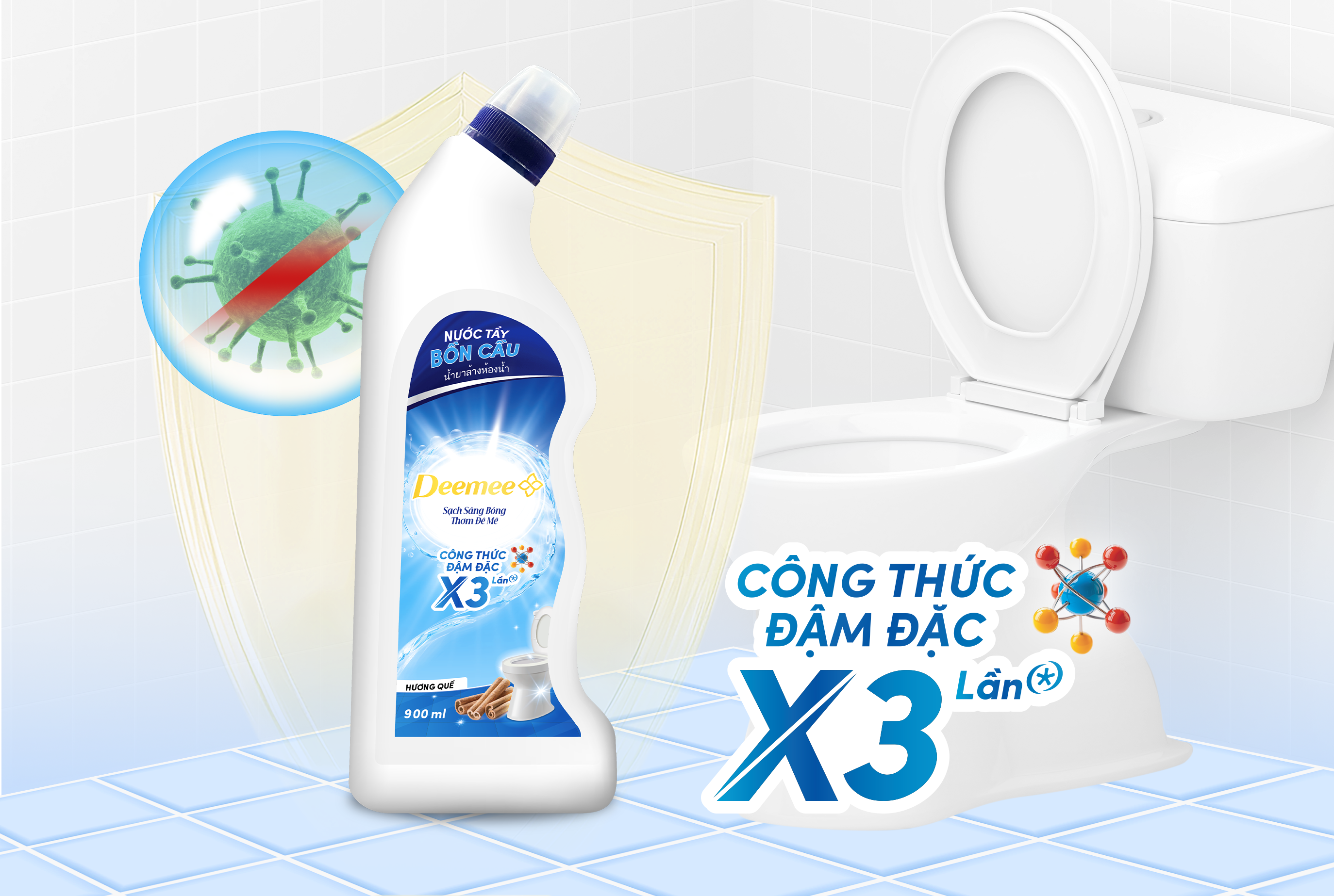 Nước tẩy bồn cầu Deemee hương quế diệt khuẩn và khử mùi hiệu quả. Sản phẩm được sản xuất với công thức đậm đặc gấp 3 lần mang tới giải pháp vệ sinh bồn cầu và nhà tắm tối ưu.